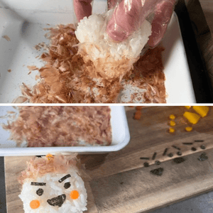 4.1個50gになるようにおにぎりを4個分作る。頭部に J&C カツオ花削り をつけ、②と③のパーツを使って顔を作る。最後に②のツノを差し込む。