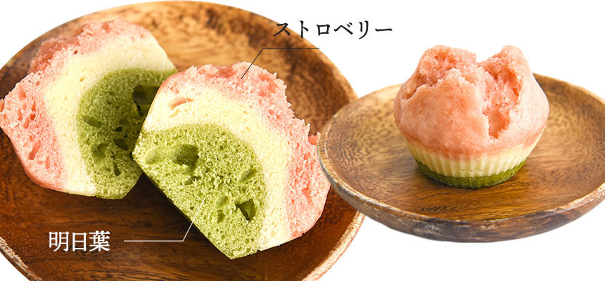 薄力粉、無調整豆乳、スクロース、オリーブオイル、ストロベリー、明日葉、ベーキングパウダー
