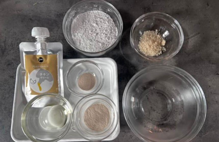 今回は、一口サイズのなんちゃってマリトッツォ。パンにたっぷりの生クリームを挟んだイタリア発祥のスイーツパンを犬用にアレンジ!米粉を使って手作りした外側バンズに、チキンクリームを入れたレシピをご紹介します。J&C プレミアムトリーツ チキンクリーム はチキンを使ったクリームタイプのおやつ。色が白っぽく、粘性もあるので、生クリームの代わりとして活用します。キャップ付きなので、好きな量だけ出して使えて便利です。