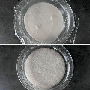 2.ボウルにパン用米粉を入れ、①のぬるま湯、米油を入れ、ヘラで手早く混ぜる。必ずラップをして40℃で20分発酵させる。(写真のように生地が膨らんでいたらOK)
