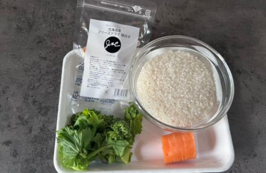 今回は、鮭白子で作る炊き込みご飯。旨みたっぷりの鮭白子のフリーズドライと、抗酸化作用のあるβカロテンたっぷりのニンジンをお米と一緒に炊き込んでつくります。フリーズドライだからこそ出せる鮭白子の旨みと、熱を加えることで甘味が引き出されるニンジンで、味付けなしでも十分美味しく仕上がります。
