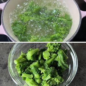 3.①の菜の花は沸騰したお湯に入れ、1分ほど茹でたら冷水で冷やし、水気を切っておく。
