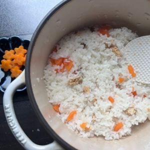 4.②が炊き上がったら、花形のニンジンを取り出し、しゃもじで軽く混ぜる。