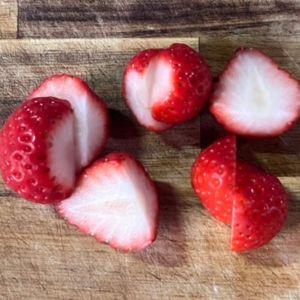 5.いちごはへたをとり、半分に切っておく。