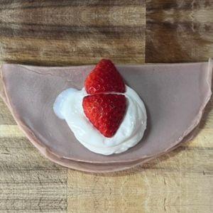 8.⑦を半分に切り、重ねて広げ、中央に④を20g程度のせ、⑤のいちごをクリームの真ん中と上に置く。