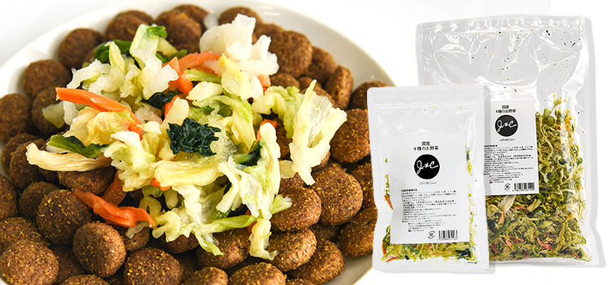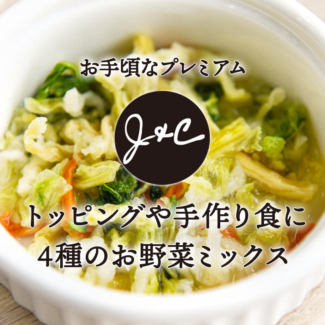 今回は新登場となったのは国産の乾燥野菜4種類をミックスした「J&C 国産4種のお野菜」。 フードのトッピングや手作りごはんに便利に使えますので、ぜひお試しください。