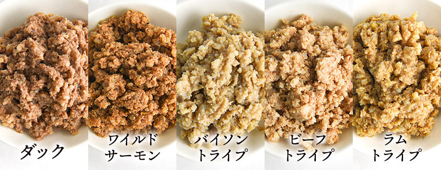 味の種類はダック、ワイルドサーモン、バイソントライプ、ビーフトライプ、ラムトライプ、5種類のラインナップです。