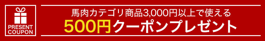 | 対象の馬肉カテゴリ商品いずれかを含む、合計金額が3,000円(税込)以上のお買いもので使える | 500円 |