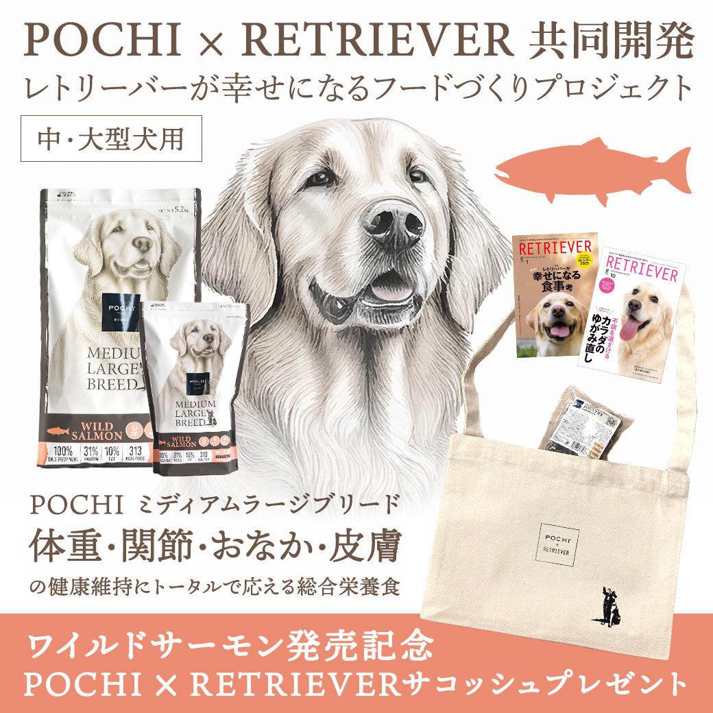 雑誌「RETRIEVER」との共同開発という形で誕生した「POCHI ミディアムラージブリード」に、待望のお魚フード「ワイルドサーモン」が新登場となりました。