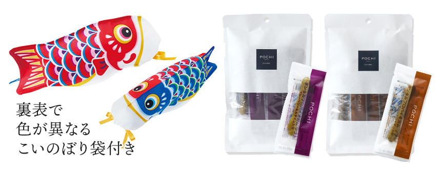 今回特別にご用意したのは、表と裏で赤と青の色違いが楽しめるこいのぼり袋が付いた特別セット。