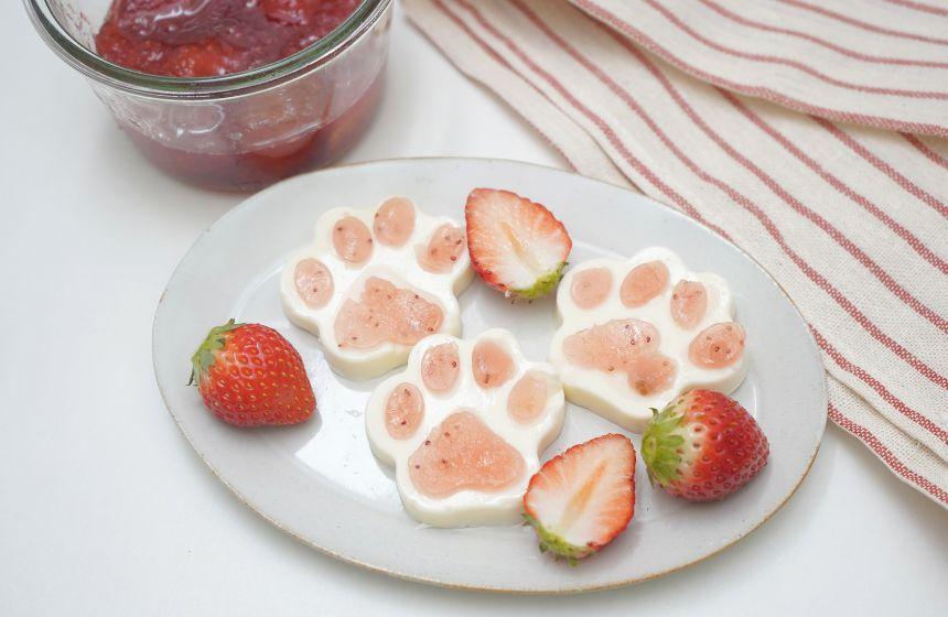 今回のレシピは、肉球柄をあしらったヨーグルトゼリーのレシピ。過去のいちごソースレシピを活用して、いちごソースを使う層とヨーグルトと豆乳をベースにした層を別々に作ります。シンプルなヨーグルトゼリーに、真っ赤な肉球柄が可愛い仕上がりのゼリーです。