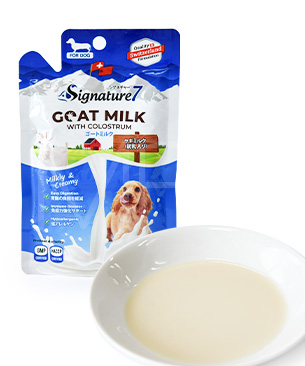 シグネチャー7からそのまま使えるヤギミルクがパウチで登場。水分補給としても、フードにかけてトッピングとしてもおすすめです。初乳入りで、健康にも配慮。