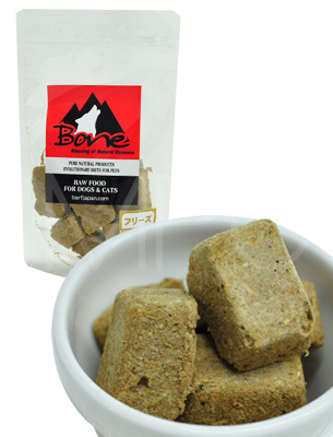 冷凍生肉の《BONE》から新登場したフリーズドライ キューブタイプは、冷凍と違い保存食に使え、とくにフリーズドライタイプは軽さが魅力です。《BONE》とは「Blessing of Natural Essence」の略で直訳すると、自然の恩恵(恵み)です。 BONEには自然の恵みともいうべき、生肉・粉砕骨・内臓・発酵野菜&果実・ハーブ・ヨーグルトなど新鮮な生の食材が多く入っています。これらの食材は大自然が育んできたタンパク質・必須脂肪・ビタミンミネラル・酵素などの栄養素、抗酸化物質を豊富に含んでいます。
