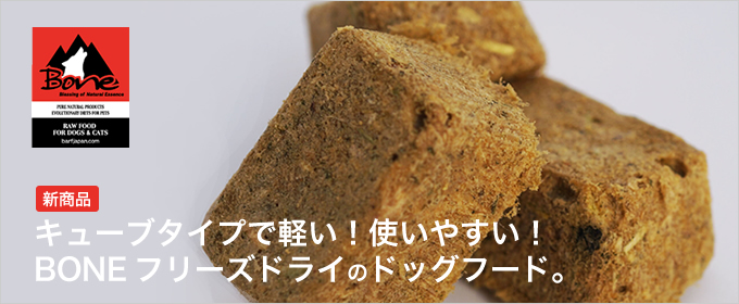 • ■新商品 BONE ドッグチキンフリーズドライ8個/1,350円 購入する(商品詳細) 栄養バランスの取れたオヤツとしても最適です。携帯時や食欲がないときのトッピングとしてもおすすめです。使いやすいキューブタイプ。