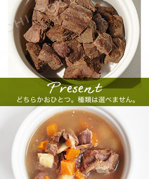 ■ 特典:1回のご注文毎に、『エゾ鹿ダイスカット80g』 または、『鹿肉のポトフ100g』 どちらかおひとつ