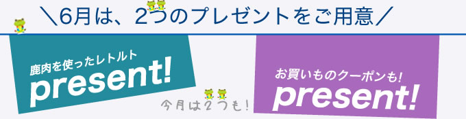 常温商品 5,400円以上のご利用の方全員に、比較的アレルギーの原因になりにくい消化の良いタンパク質である鹿肉のレトルトを、さらに、7,560円以上の方には、お買いものにうれしい500円クーポンもプレゼント。