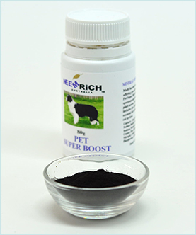 おなかを壊しやすい犬へおすすめのニームリッチ スーパーブースト。フタを開けると真っ黒な粉でびっくりするかもしれませんが、鉄、亜鉛、ヨウ素など10種類以上のミネラルを含み、不足しがちな成分を補うことで犬たちの健康維持に役立ちます。