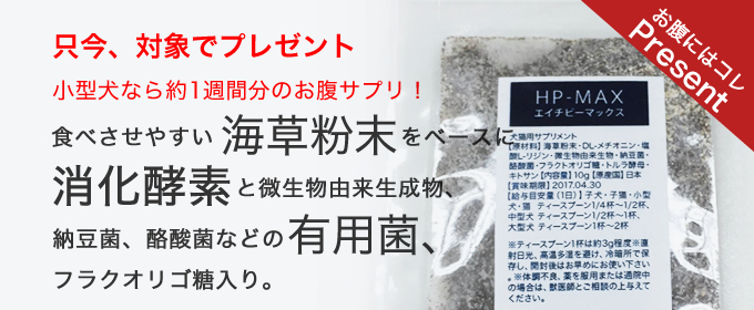 すべての酵素はタンパク質をベースに作られていて、熱に弱く、加工加熱食品では、利用される食材の食物酵素はほとんどないのが現状です。 昔から焼き魚に大根おろしを添えるといった日本人の知恵には頭が下がります。 プレミアムフードにはさまざまな工夫もありますが、基本的には加工加熱食品であるドッグフードを主食にしている犬たちのお腹に、 ぜひ大根おろしに変わる知恵としてお手ごろな『HP-MAX』がオススメです。