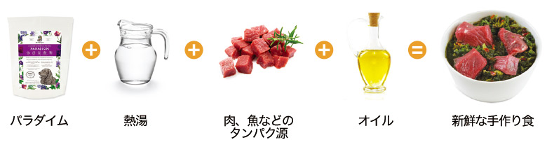 パラダイムに熱湯を加え、お肉(タンパク源)とオイルをまぜるだけ。