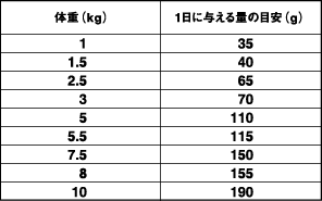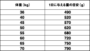 | 体重 | 給与量/日 | 体重 | 給与量/日 |