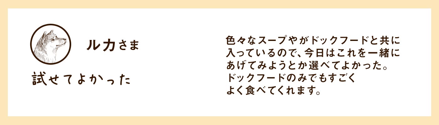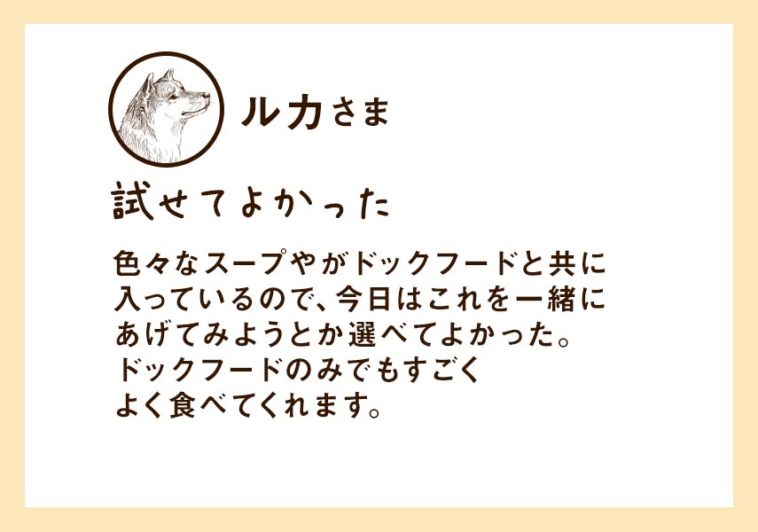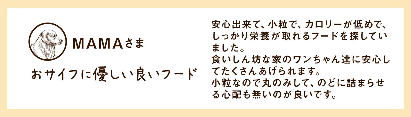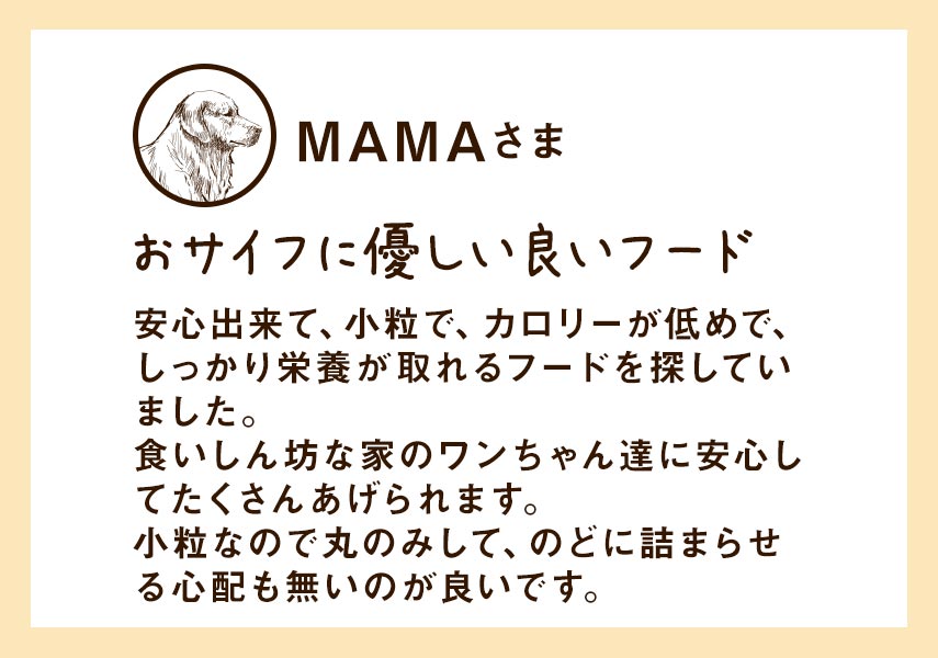 私たちのフードやおやつは、犬の健康とお客さまの喜びにつながるかを基準に、化学薬品・酸化防止剤など、危険な添加物が含まれていないものであることはもちろん、「これは!」と自信を持っておすすめできる商品です。