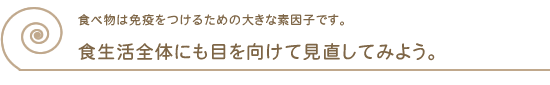 例えば、体を温める生姜を食事に取り入れたり、 最近では腸管免疫系の異常が花粉症を引き起こす重要な要因として指摘されるようになっているので、 腸内環境を整えるために、食物繊維の多い野菜や海草、ヨーグルトや乳酸菌飲料などを積極的に食べたり、 消化酵素のサプリメントを利用したり…。