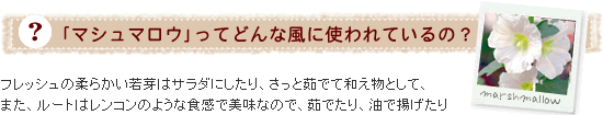 マシュマロウはフラワー(花)、リーフ(葉)、ルート(根)のすべてが利用でき、イタリアのある地方では働き者で明るい女性のことを「マシュマロウのような人」と呼ぶ風習があり、どの部分をとっても不要なところがなく、すべてが役立つ花に例えられることは女性にとって誇りといえそうです。