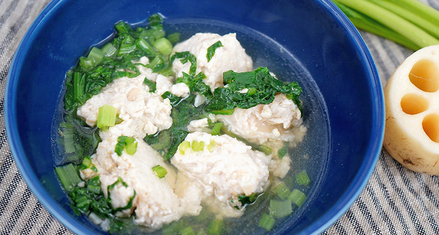 5.鍋にだし汁、小松菜、③の鶏つみれを入れて火が通るまで中火で煮る。器に移す。