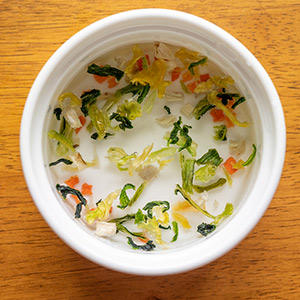 1. POCHI OYASAIをお湯で戻します。15分ほどすると野菜が膨らんできます。