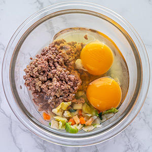 2.もどした野菜に卵2個とエゾシカミンチをボウルに入れ、一緒にかき混ぜておきます。