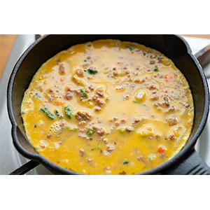3.スキレットに油を入れ、スキレットから少し煙が出るほど弱火で温めてから2.を一気に流し入れます。流し入れたら、ヘラなどで中心をかき混ぜながら食材を均等になる様に整えます。蓋をしてとろ火〜弱火で4〜5分ほど焼きます。