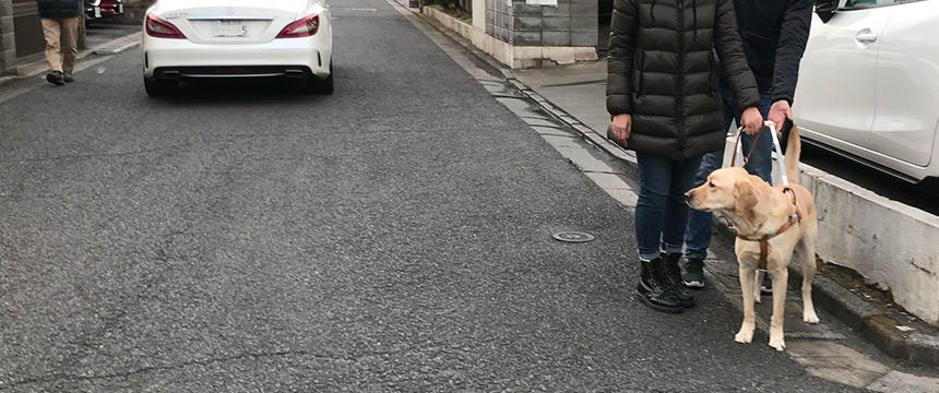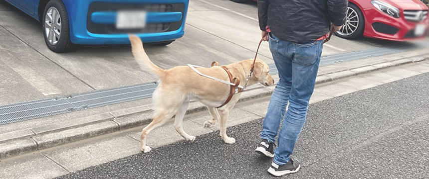 道を進んでいった先では、車が私たちの正面からやってきました。歩くことにやっぱり夢中の私はそれに気づかず、歩き続けようとしたのですが、犬は静かに立ち止まりました。「あれ?」と思わず声が出てしまった私に歩行指導員さんが「車が通るので立ち止まったんですよ」と教えてくれました。