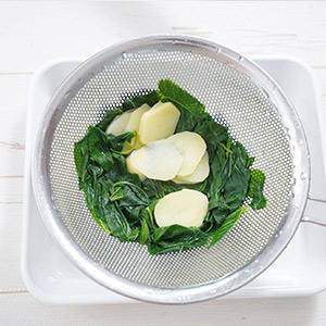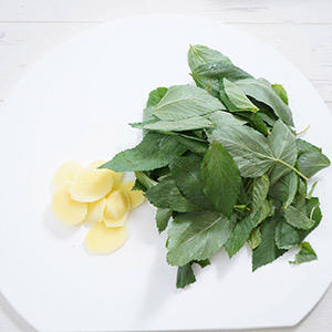 1.じゃがいもの皮をむき芽を取り除き、薄切りにする。モロヘイヤは葉と茎に分ける(葉を使用)。