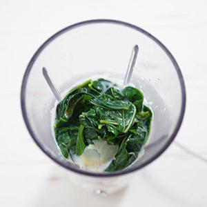 3.2のじゃがいもとモロヘイヤ、無調整豆乳、水をミキサーに入れ、なめらかになるまでかける。