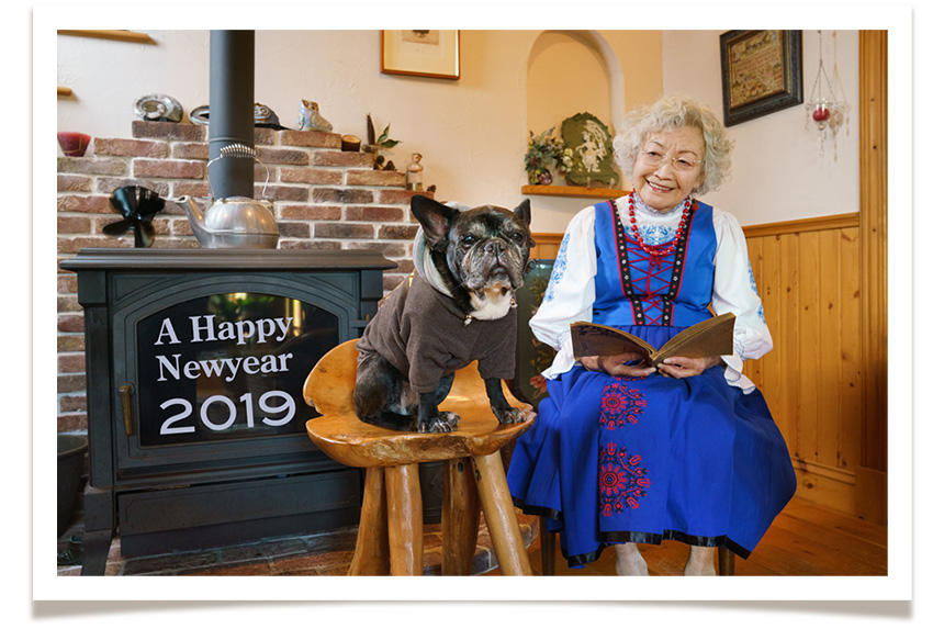 母は今年85歳になったが、元気である。残念ながらマリーは2017年に亡くなり、その後はたびたび訪れる我が家の歴代の犬たちがモデルを引き継いでいる。この年賀状を毎年楽しみにしている人も多いようで、老後の山の暮らしの美しい側面が1枚の写真から伝わっているのだとしたら、とても嬉しい。