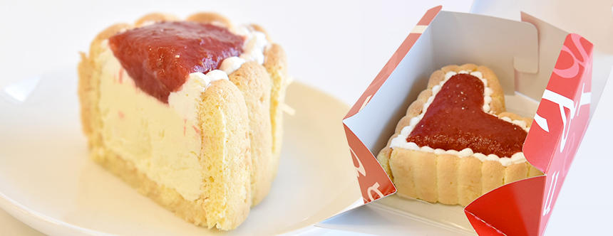 バレンタインに合わせた真っ赤なハートが目を引く今年のバレンタインケーキは、レアチーズケーキの滑らかさとサクサクのクッキーで食感まで楽しめます。