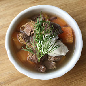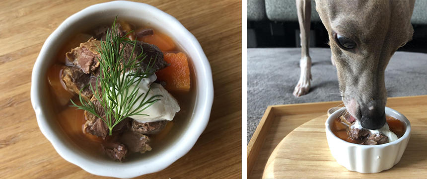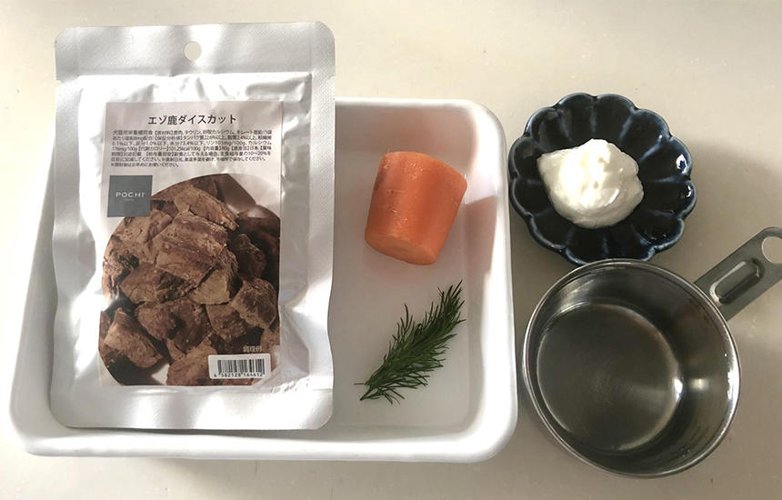 具材は人参だけでちゃんと食べてくれるかなと少し不安でしたが、旨味たっぷりの鹿肉がいい匂いを引き立て美味しいスープに仕上がりました。トッピングのヨーグルトももちろんペロリ。飼い主としては、こんなに簡単でとても喜んでくれたので、我が家の定番手作りメニューのひとつに決まり。