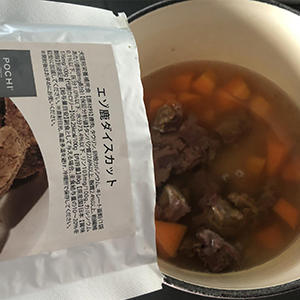 3.2の鍋に、POCHI エゾ鹿 ダイスカットを入れ、沸騰したら火を止める。
