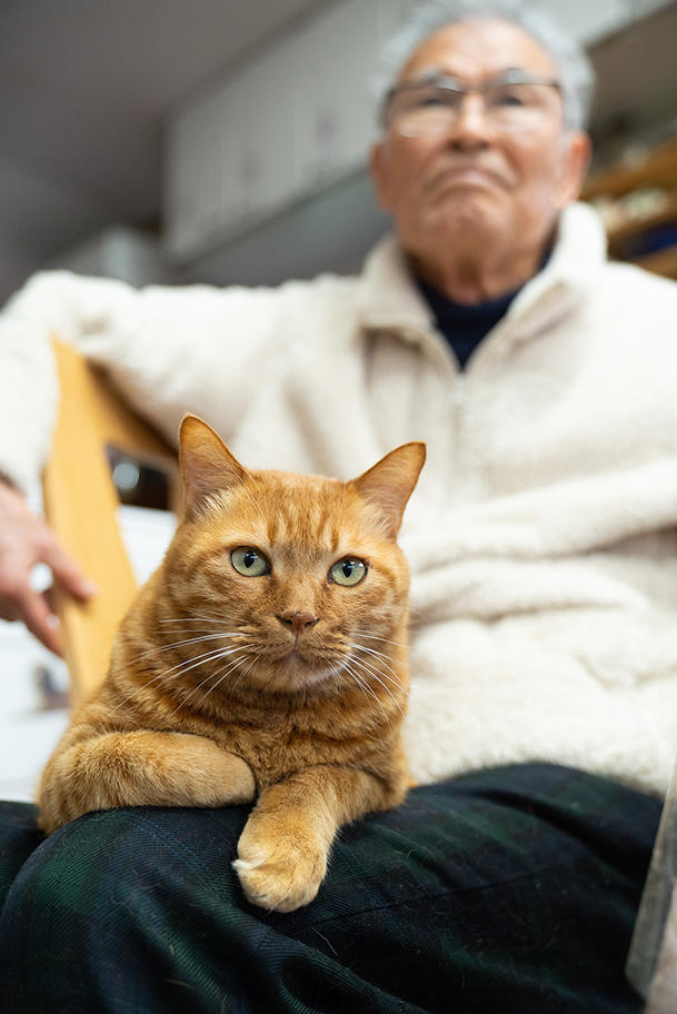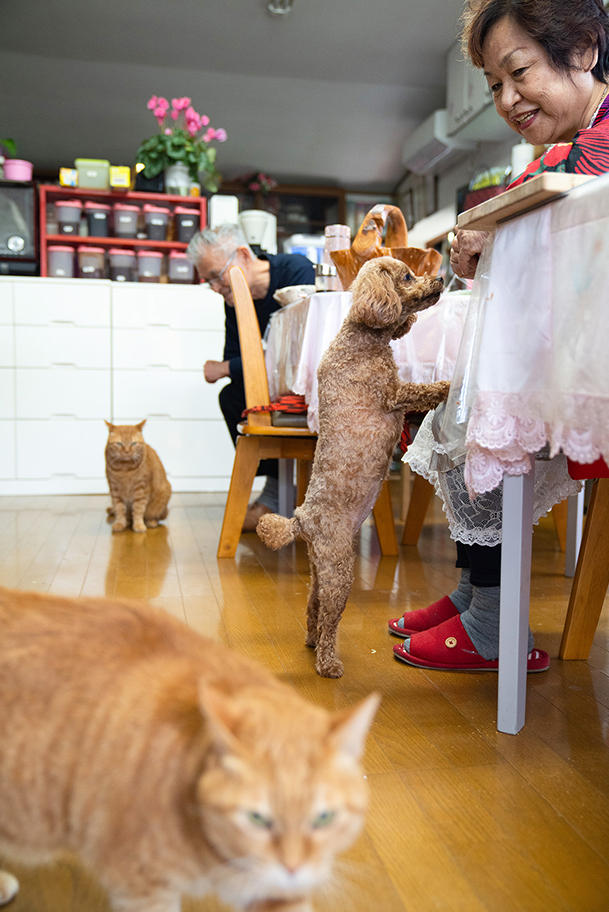 シニアの2人暮らしのご夫妻にとって、モモ、シマとクローバーはかけがえのない癒しの存在だ。「私は犬派。主人は猫派。私はモモと、主人は猫たちと、それぞれ別々の寝室で寝ています」。もともと夫妻とも動物好きで、シマとクローバーの前にも猫が、モモの前にはミニチュア・ダックスフントがいた。特に、軽度の認知症を患うご主人にとって、猫の存在は大きい。「前の猫が亡くなったショックで主人は認知症になってしまったんですよ。でも、1年くらいしてシマとクローバーが来て、元気を取り戻してくれました」。確かに、猫たちをあやすご主人はとてもお元気そうだ。