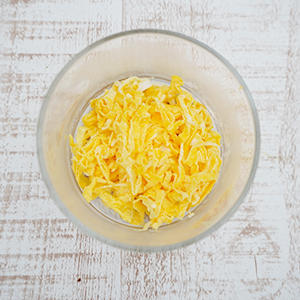2.ボウルに卵を入れて溶きほぐし、フライパンにサラダ油(分量外)をなじませ卵の両面を薄焼きにして粗熱が取れたら千切りにして錦糸卵にする。