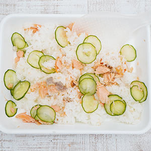 4.ごはんにきゅうりと鮭を入れて混ぜる。