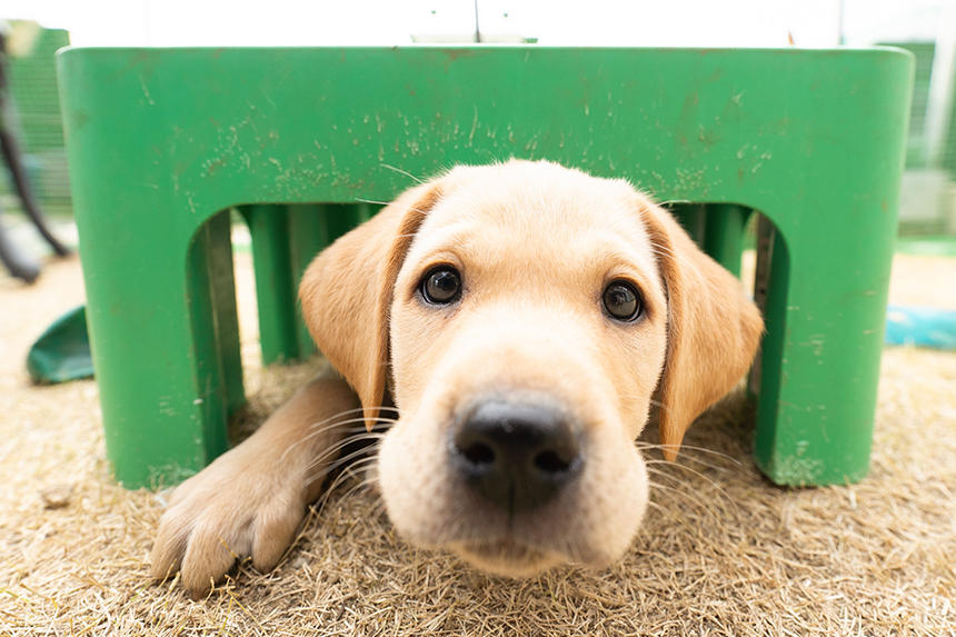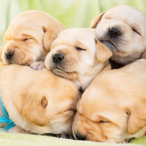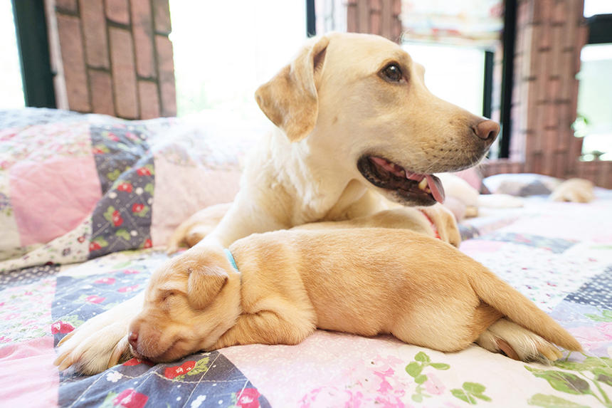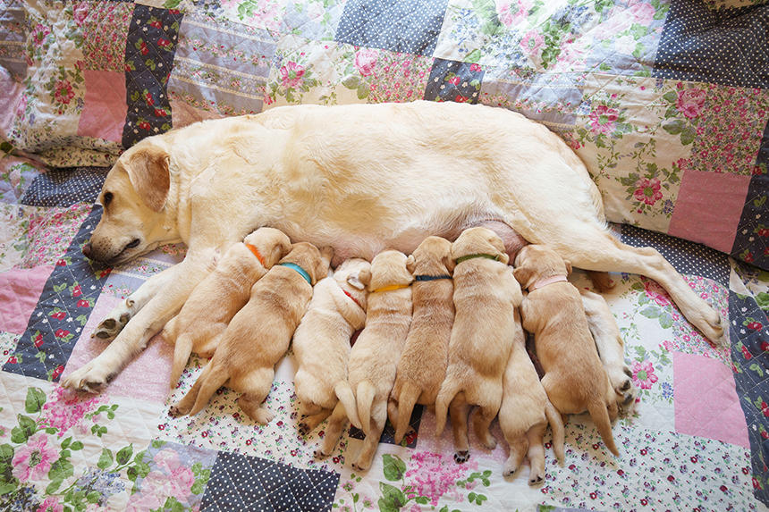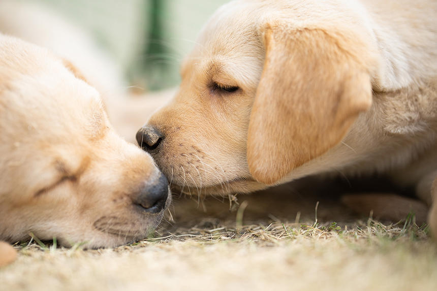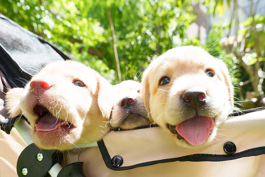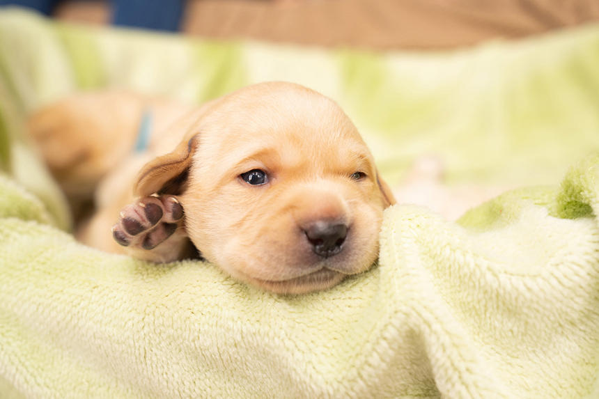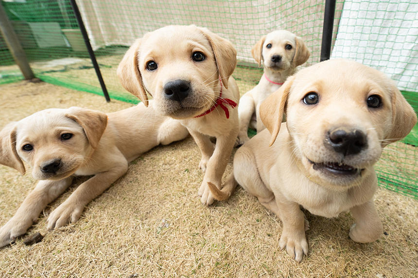 今回お届けしているのは、昨春と今春に生まれたアイメイト(公財「アイメイト協会」出身の盲導犬)候補の子犬たちの写真だ。犬種はラブラドール・レトリーバー。アイメイトの育成には大勢のボランティアが関わっており、子犬の出産は、メスの繁殖犬を預かる「繁殖奉仕者」の家庭で行われる。一度に生まれる子犬は3頭から10頭ほど。家庭犬の場合、今は生後3ヶ月以上でブリーダーやペットショップから迎えるのが一般的だから、 アイメイトの繁殖奉仕家庭は、生後間もない子犬を見られる貴重な場所だ。