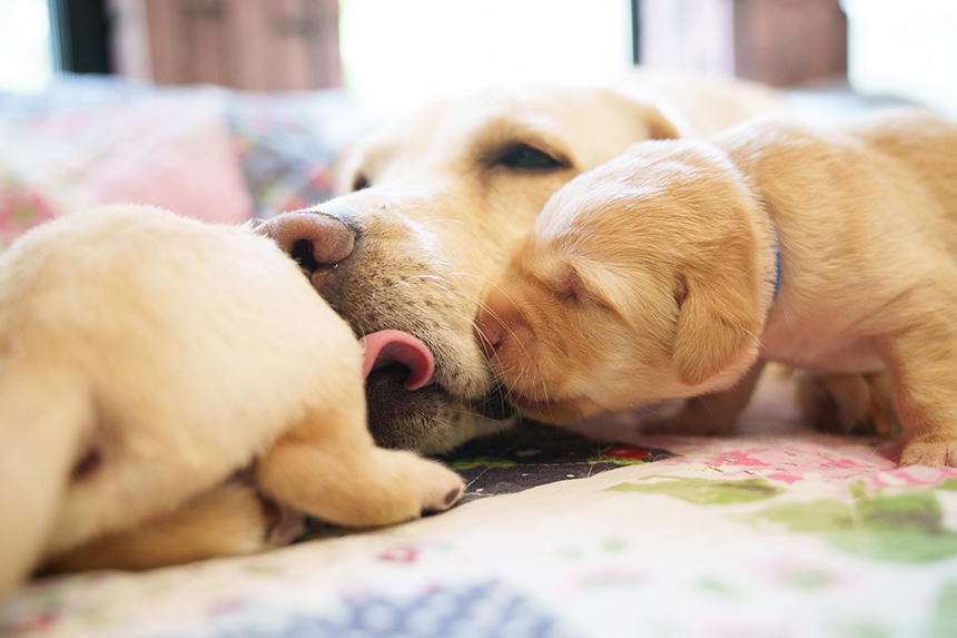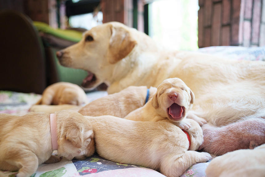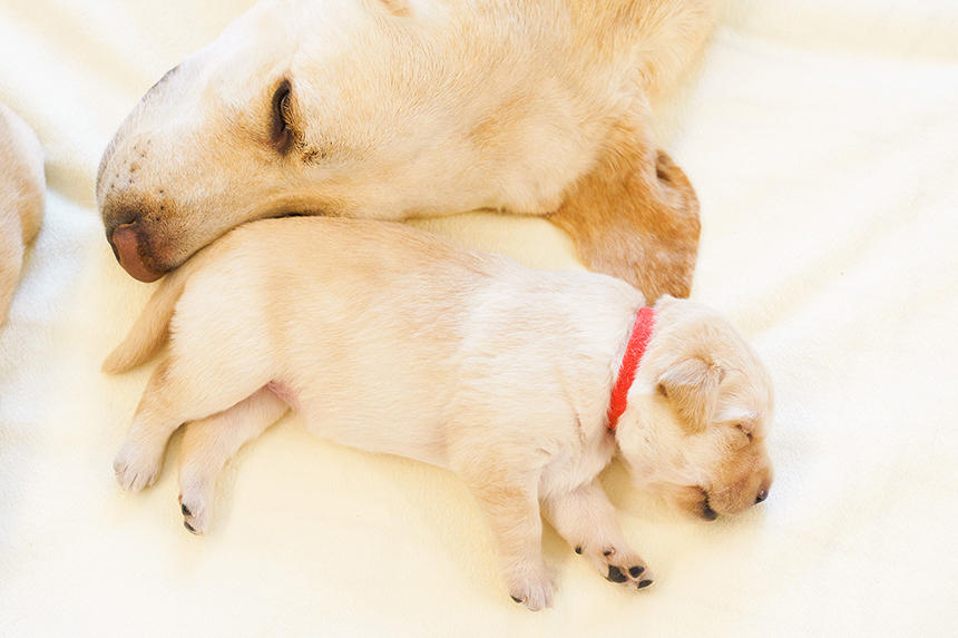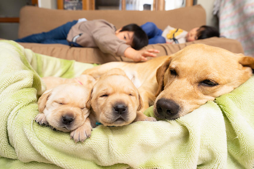 この時期の乳飲児たちはまだ目が開いておらず、人よりも母犬にべったり。母の愛をたっぷり受け、まずは全ての基礎となる犬の本能的な愛情を育んでいく。