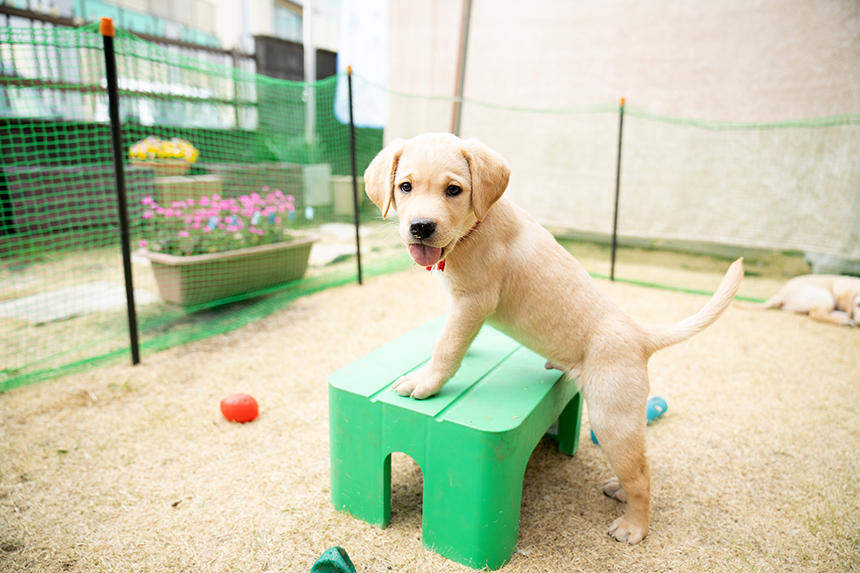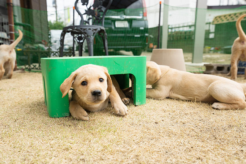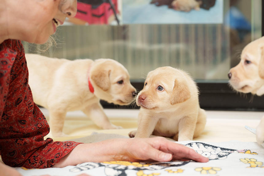 子犬たちが繁殖奉仕家庭で過ごすのは、生後2ヶ月まで。巣立ち前にワクチン接種を済ませ、環境によっては自宅の庭で駆け回ることも。そして、1頭ずつ、1歳過ぎまで預かる「飼育奉仕者」にバトンタッチする。飼育奉仕家庭では、人との愛情を育んでゆく。