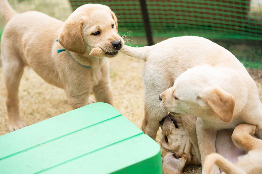 アイメイト候補の子犬は、生まれた瞬間から愛情をたっぷり受けている。だから、動物的本能を維持しながらも、決して相手を傷つけることなく上手に遊ぶ。僕は、アイメイトが人や動物に牙をむいたり、敵意を持って吠え立てるような姿を一度も見たことがない。小さな子犬たちに、人が見習うべき点は多い。