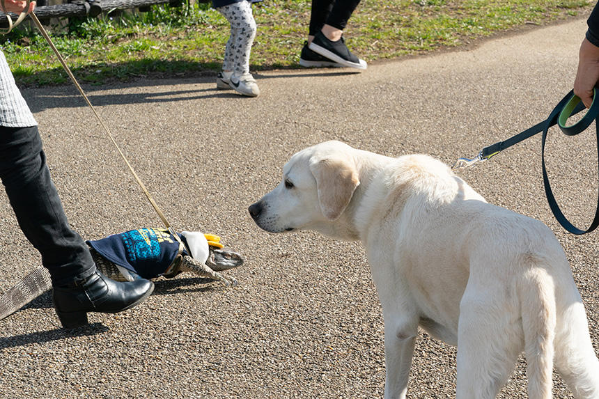 最初は警戒していたり、攻撃的だったりする犬も、マメスケの穏やかさに触れると、一様にフレンドリーになるか関心を失って去っていく。こんなこともあった。「噛むから気をつけてください!」と言いがら、前からイグアナと飼い主さんが緊張した様子で歩いてきた。でも、イグアナは長い舌を出し入れしながら、自然体でこちらに向かってきた。飼い主さんは、「あら?この子は大丈夫なのね?」と、びっくりした様子。普段は絶対に犬には近付かないとのことだったが、マメスケとは至って平和的な邂逅を果たしたのであった。