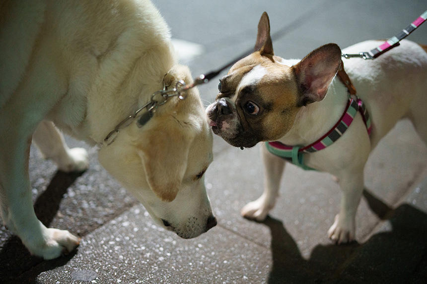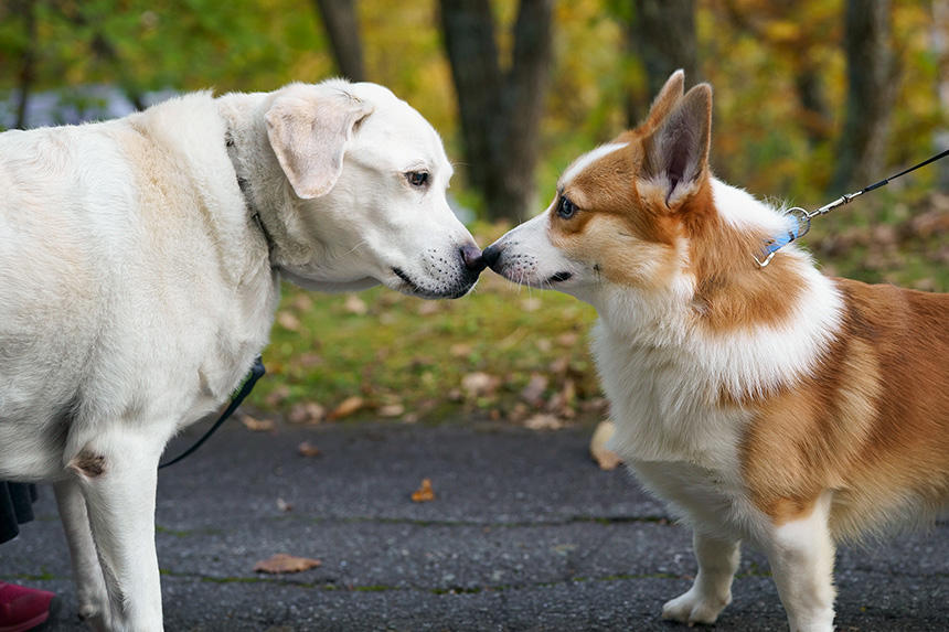 リタイアした今は、マメスケには散歩中の犬同士のあいさつも自由にさせている。顔の表情は比較的無表情だが、いつもしっぽをグルングルン回して喜んでいて、実は触れ合いが大好きだ。初めにお尻を嗅ぐこともあるが、それよりも、鼻と鼻、顔と顔をくっつけるアプローチの仕方が多い。好戦的な犬同士だと顔から行くとケンカになってしまうこともあるが、マメスケの場合は、それでも相手を怒らせたことはない。安心した相手が、頭や耳、鼻をペロリと舐めてくることもある。