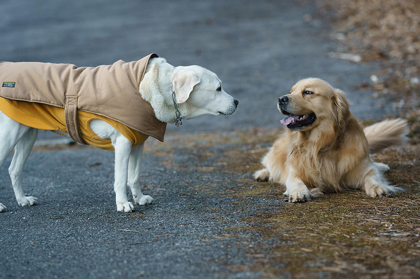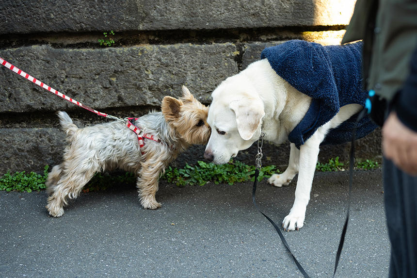 「こんにちは!」と若い犬に元気に挨拶され、「あっ、よろしくね・・・」と控え目に答えているマメスケの小声が聞こえそうな、平和なあいさつ風景なのである。