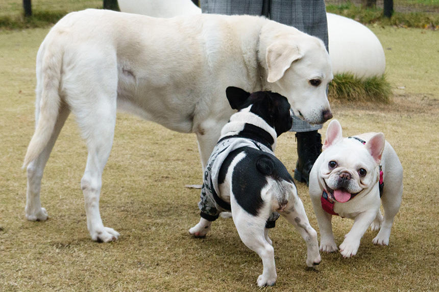マメスケがおとなしいからといって、マウンティングされたり、しつこく追いかけ回されたりするようなこともない。大型犬ということもあり、弱い存在だとは見られていないと思う。