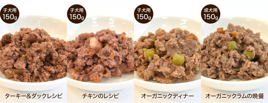 今回新登場となったのは、総合栄養食のウェットフード、パピー用3種と成犬用1種です。